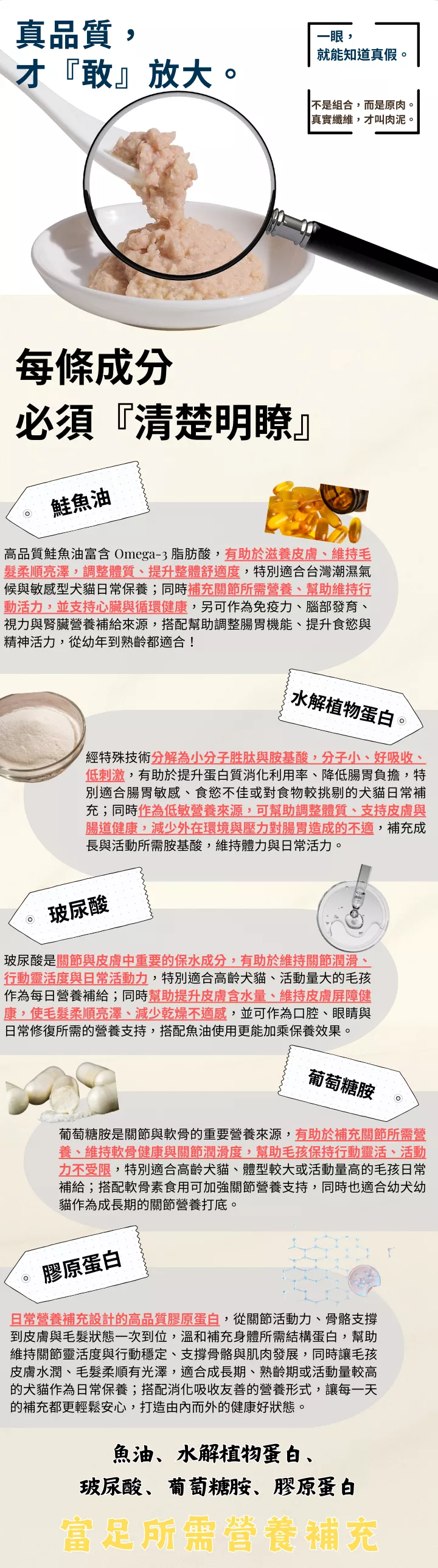 A2:別擔心!我們的關節保健肉泥條經過專業調配與適口性測試,90%以上的毛孩都願意主動食用。您也可以將其作為零食或拌入飼料,來提高毛孩的接受度。