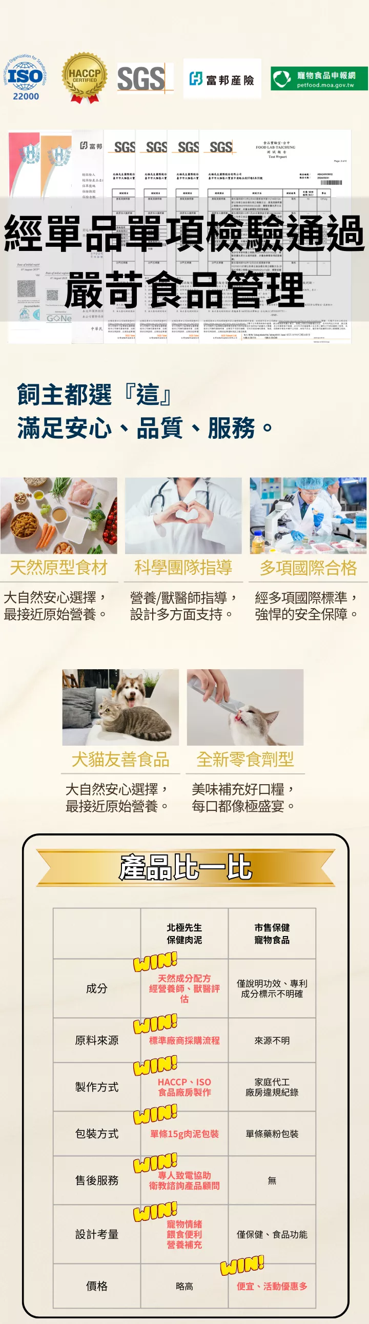 A8:我們的產品堅持「天然、低敏、無添加」的原則,無防腐劑、人工色素與香料。全程在台灣製造,並通過 SGS 檢驗、ISO22000 及 HACCP 認證,讓毛孩吃得健康又安心。